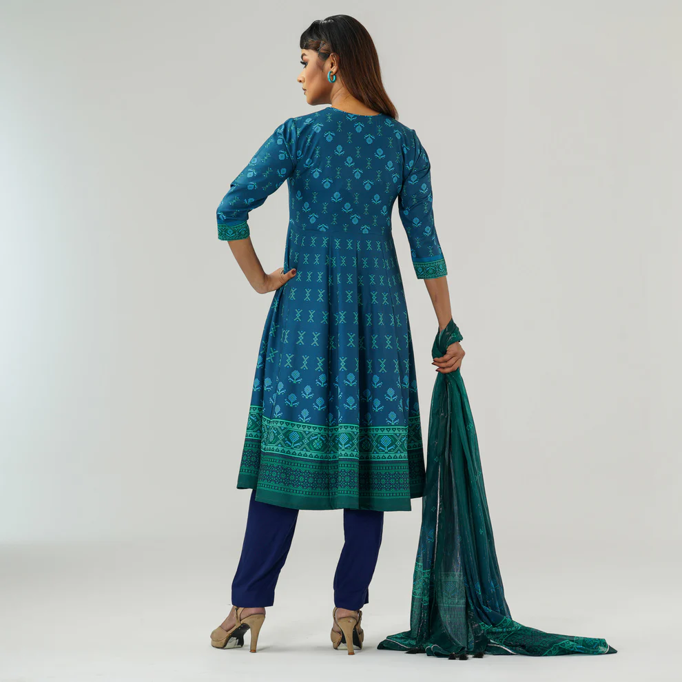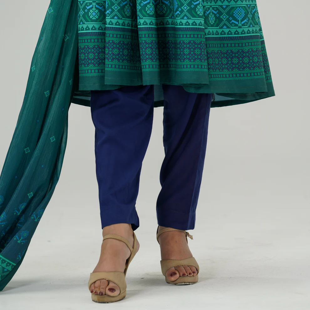 This elegant three piece set features a digital-printed blended cotton kalidar kamij, paired with a solid pant for a classic look. The matching georgette orna with digital prints adds a graceful touch, making it a perfect choice for festive and traditional occasions.