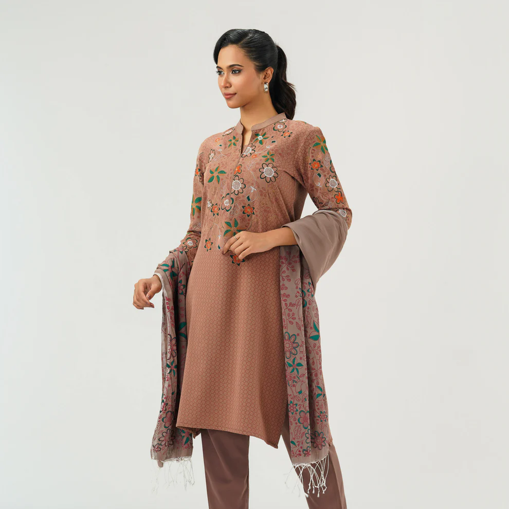 This elegant straight-cut three piece set in a rich hazelnut tan color is crafted for both style and comfort. The cotton-blended body features intricate screen prints and manual embroidery, adding a touch of sophistication. Paired with a soft blended bottom and a half-silk dupatta adorned with screen prints, this ensemble is perfect for Eid celebrations and festive occasions.